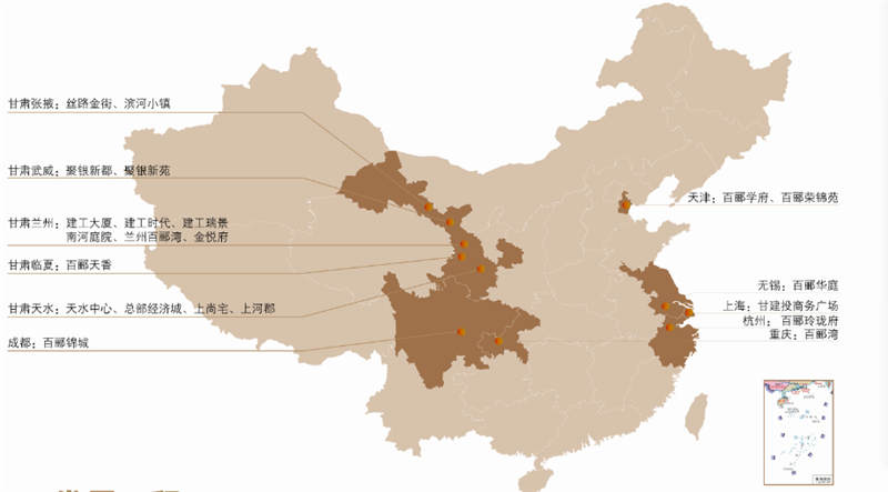在“十三五”期間,置業(yè)公司立足長遠,在蘭州、張掖、天水、武威、臨夏等絲路黃金段城市大力開發(fā)房地產,同時以全新的思路、全新的視角積極開拓市場,聚焦國家重點規(guī)劃建設的京津冀、長江經濟帶、成渝等區(qū)域省會城市+一二線城市,構建了均衡穩(wěn)健的全國性戰(zhàn)略布局,“大地產模式”版圖逐步成型。公司堅定推進“走出去”戰(zhàn)略,自2015年至2020年間,置業(yè)公司相繼在上海、天津、成都、重慶、杭州、無錫等地開發(fā),截至目前公司正在開發(fā)土地441.99畝,儲備土地1438.38畝,其中省內儲備1280.71畝,省外儲備157畝,這些土地資源的儲備為公司持續(xù)發(fā)展奠定了堅實基礎。