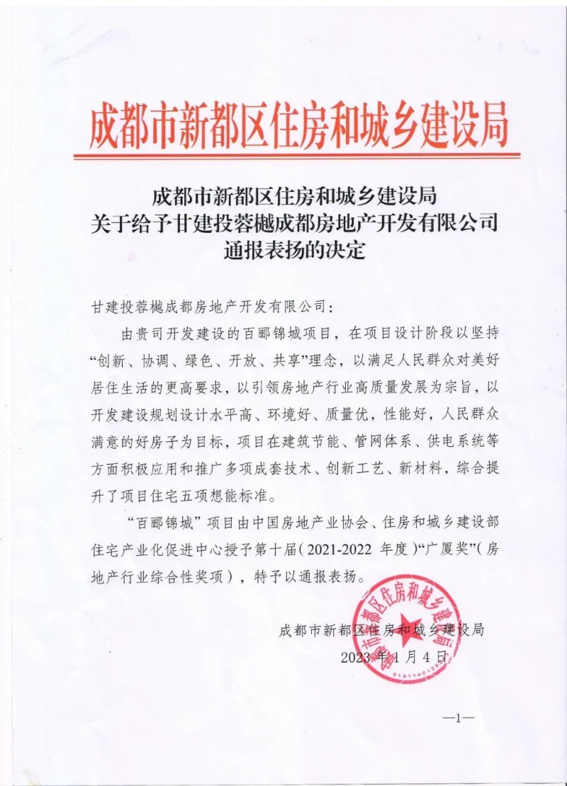 近日,成都市新都區(qū)城鄉(xiāng)和住房建設(shè)局對(duì)甘肅建總置業(yè)發(fā)展有限公司成都公司開發(fā)建設(shè)的百酈錦城項(xiàng)目榮獲中國(guó)房地產(chǎn)業(yè)最高榮譽(yù)“廣廈獎(jiǎng)”(2021-2022年度)予以通報(bào)表?yè)P(yáng)。