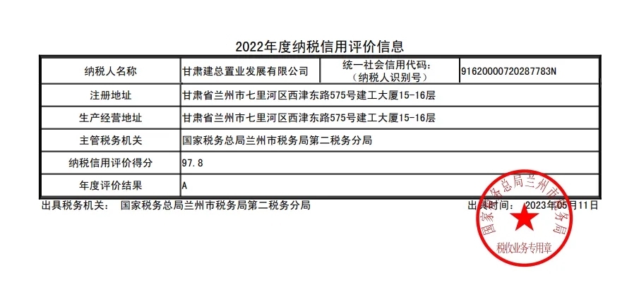 近日,在國家稅務(wù)總局甘肅省稅務(wù)局開展的2022年度納稅信用等級評定工作中,甘肅建總置業(yè)發(fā)展有限公司獲評“甘肅稅務(wù)系統(tǒng)納稅信用A級納稅人”榮譽稱號。此次獲評是置業(yè)公司首次榮獲該榮譽稱號,為公司融資、審計等業(yè)務(wù)提供了良好的信譽保證,進一步提升了企業(yè)軟實力。