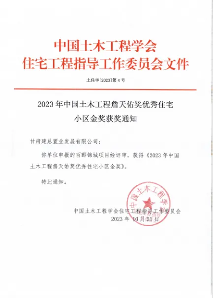 “詹天佑獎優(yōu)秀住宅小區(qū)金獎”是百酈錦城項目繼2022年榮獲地產(chǎn)行業(yè)最高榮譽“廣廈獎”之后又一國家級重要獎項,是甘肅建投首個同時獲得“廣廈獎”和“詹天佑獎優(yōu)秀住宅小區(qū)金獎”的項目,充分體現(xiàn)了業(yè)界對甘肅建投地產(chǎn)質(zhì)量、品質(zhì)及科技創(chuàng)新的肯定。