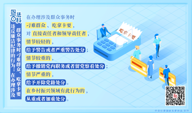 《中國(guó)共產(chǎn)黨紀(jì)律處分條例》第一百二十二條規(guī)定,在辦理涉及群眾事務(wù)時(shí)刁難群眾、吃拿卡要,對(duì)直接責(zé)任者和領(lǐng)導(dǎo)責(zé)任者,情節(jié)較輕的,給予警告或者嚴(yán)重警告處分;情節(jié)較重的,給予撤銷(xiāo)黨內(nèi)職務(wù)或者留黨察看處分;情節(jié)嚴(yán)重的,給予開(kāi)除黨籍處分。
